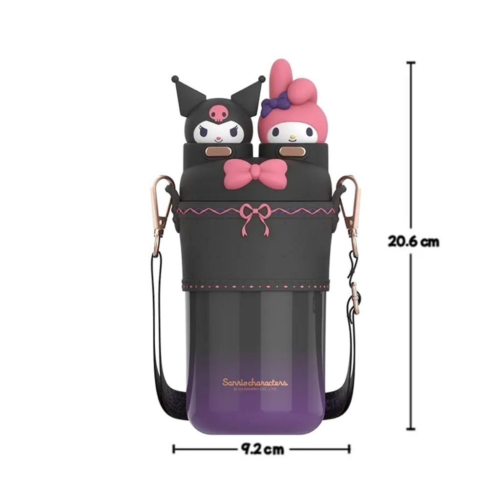 Botella termica de Hello Kitty o Kuromi, hecha en acero inoxidable, doble pico, uno con sorbete de silicona y otro con boquilla ancha, detalle en ambos picos de personaje en silicona, superficie antideslizante, tapa con apertura automtica y sistema antigoteo, correa desmontable.
