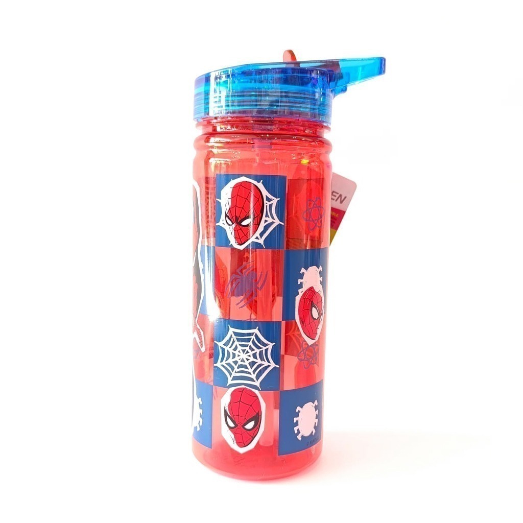 Botella Spiderman de plaatico resistente libre de BPA para un uso seuro y saludable, con pico y sistema antigoteo para evitar derrames, con manija de agarre.