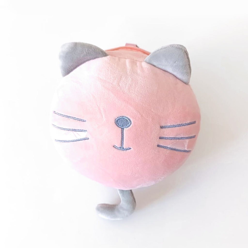 Almohada de viaje en tela de peluche aterciopelado hipoalergenico suave y delicado, con relleno de espuma viscoelastica, viene con un antifaz incorporado para poder descanzar sin luces molestas durante el viaje. Su diseño es super compacto para poder trasladar sin inconvenientes. Con detalles bordados de un simpatico Gatito