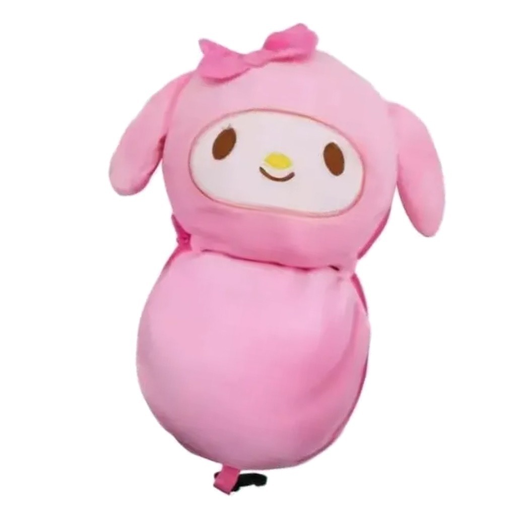 Almohada de viaje en tela de peluche aterciopelado hipoalergenico suave y delicado, con relleno de espuma viscoelastica, viene con un antifaz incorporado para poder descanzar sin luces molestas durante el viaje. Su diseño es super compacto para poder trasladar sin inconvenientes. Con detalles bordados de My Melody