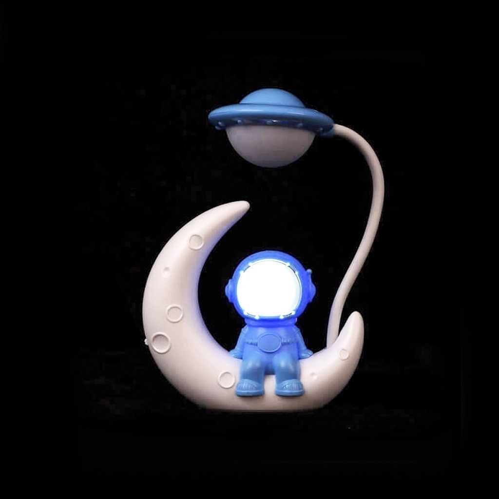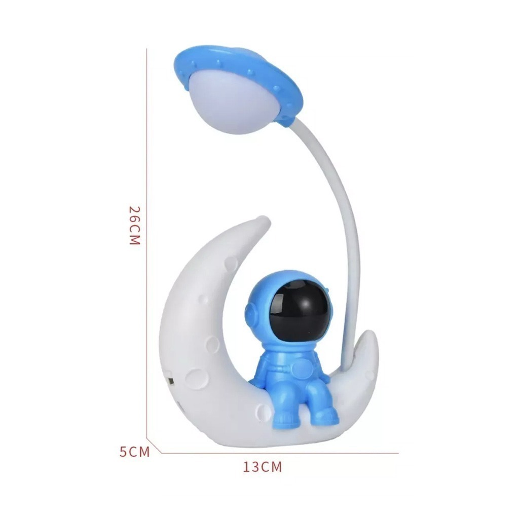 Lampara luz LED astronauta, cuenta con un boton lateral para ajustar la primer luz (cara del astronauta) y bajando el interruptor ajustas a la segunda luz (lampara). Carga mediante USB (incluido)