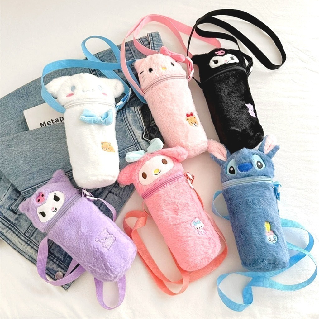 Porta botellas de peluche hipoalergenico, suave y delicado, con correa regulable para su facil transportacion, idel para llevar tus bebidas con la mejor de las ondas! Con diseños hermosos de personajes para que elijas el que mas te gusta.