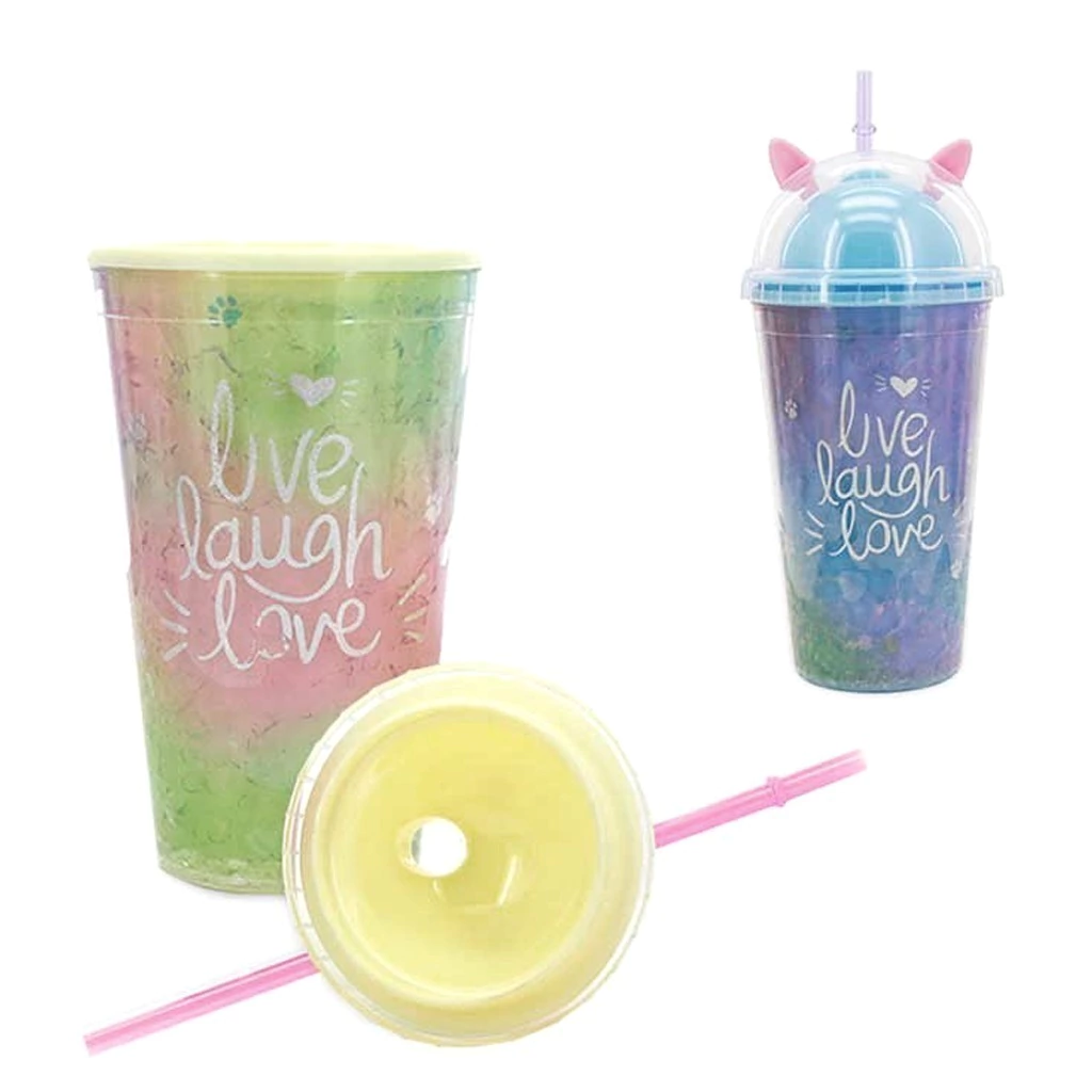 Vaso con doble capa de acrilico, hidrogel para mantener tus bebidas frias, tapa esfera con detalle de orejitas en silicona y bombilla.